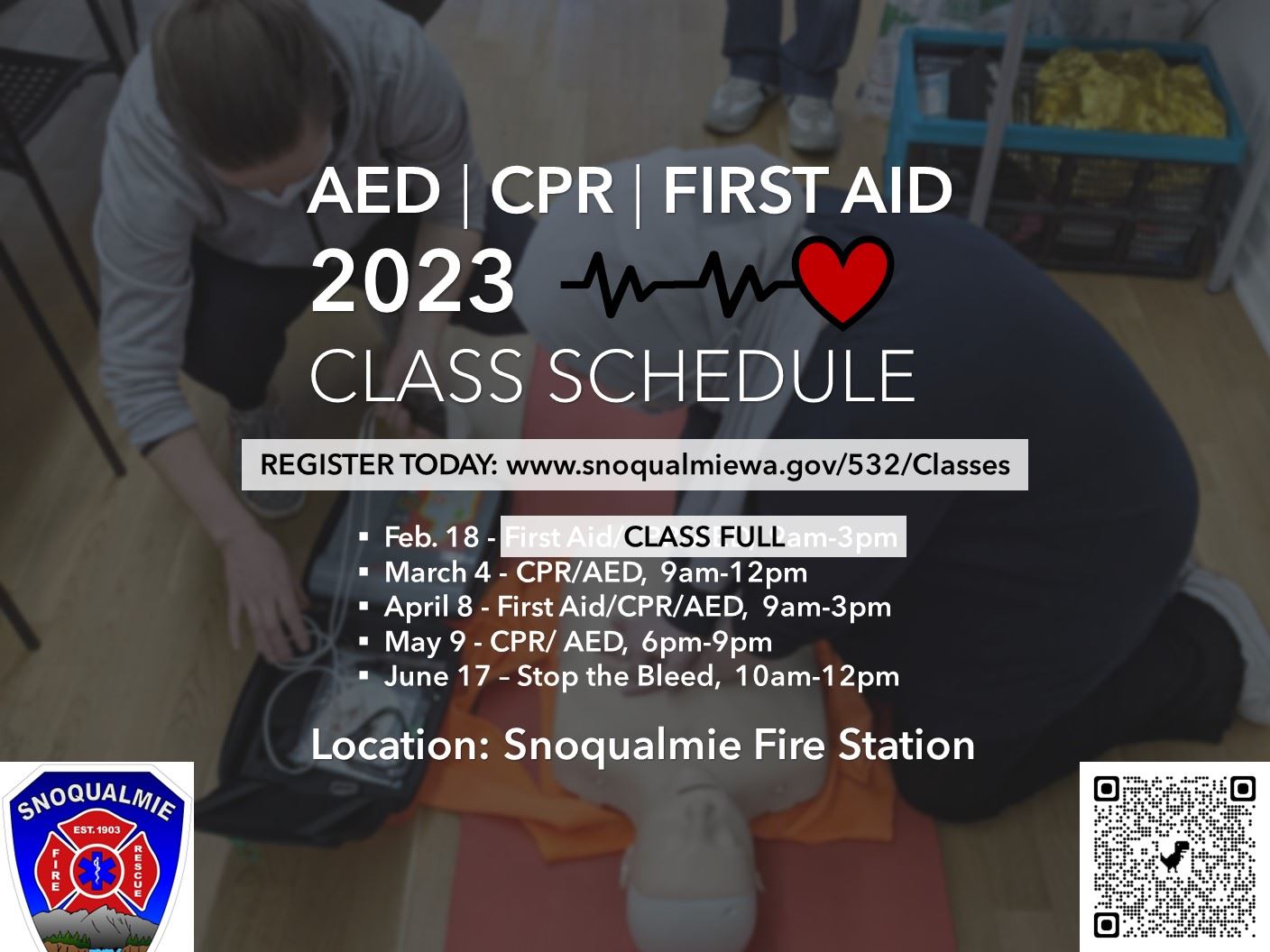 The Snoqualmie Fire Department is hosting First Aid/CPR/Automated external defibrillator (AED) classes, CPR/AED classes, and a Stop the Bleed Class in the first half of 2023. All classes will be held at the Fire Station located at 37600 SE Snoqualmie Parkway. First Aid/CPR/AED is $45 and CPR/AED is $35. Stop the Bleed is a free class.