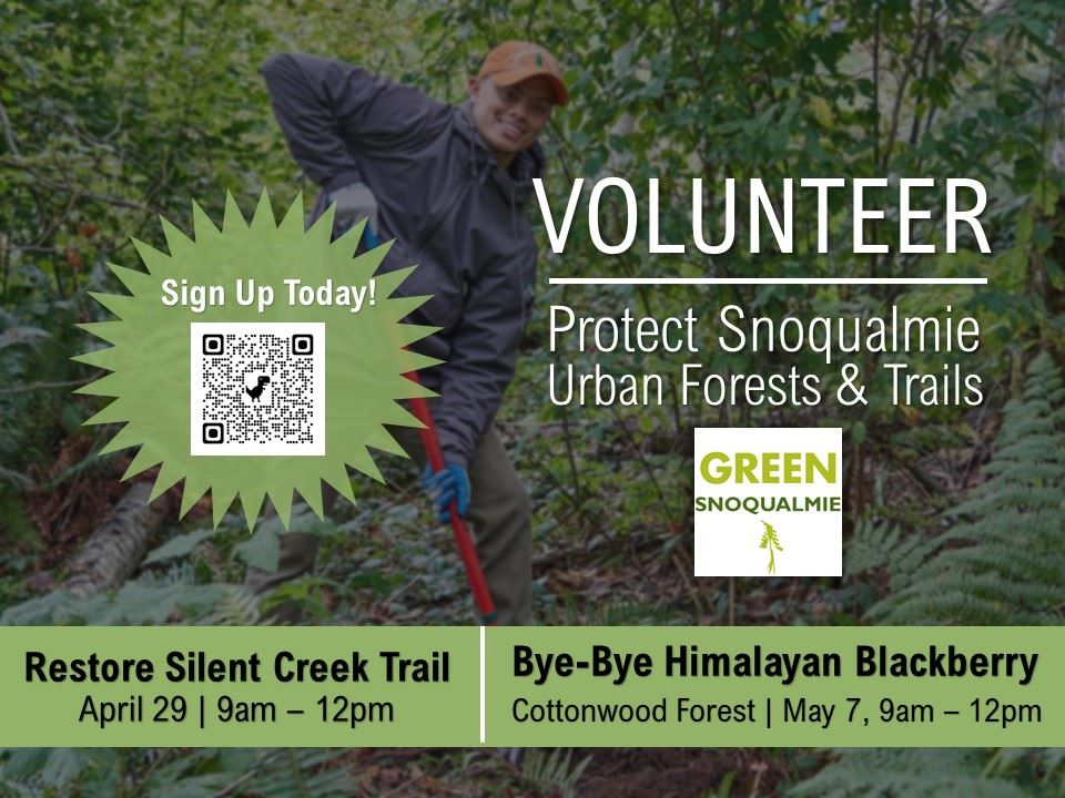 The Green Snoqualmie Partnership has two upcoming volunteer events that will help maintain the health of Snoqualmie’s Urban Forests and local trails. Join your neighbors, enjoy the spring weather, and protect the urban forests that make Snoqualmie one of the most unique small cities in King County.