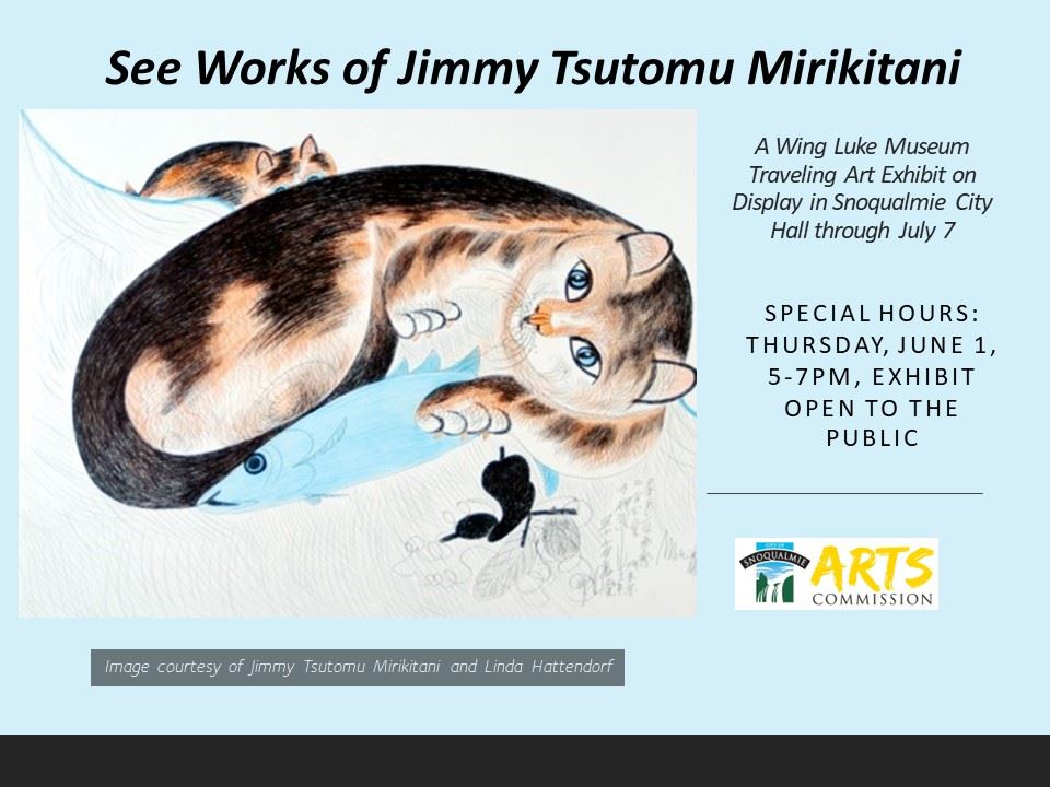 The Snoqualmie Arts Commission invites residents and visitors to view the powerful works of artist Jimmy Tsutomu Mirikitani. Special hours on June 1, 5-7 pm, City Hall upstairs and downstairs lobbies.