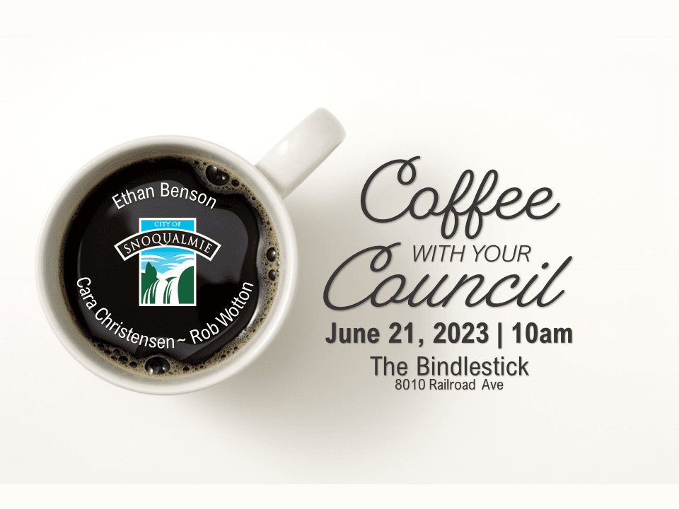Snoqualmie residents are invited to join City Councilmembers Ethan Benson, Cara Christensen, and Rob Wotton for coffee and conversation on Wednesday, June 21, 2023.