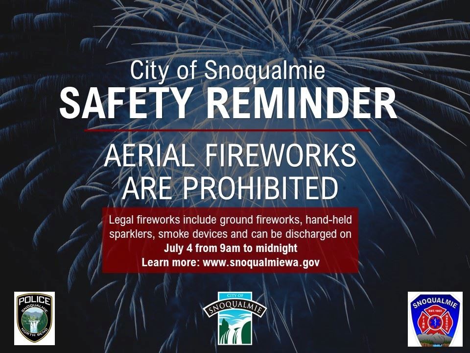As we prepare for the Fourth of July holiday, the Snoqualmie Fire department would like to remind you about fireworks regulations in the City of Snoqualmie and to use caution in our dry weather. Legal fireworks should be ignited away from any structures, dry grass, or brush. Adults should be present and always have a water source nearby.