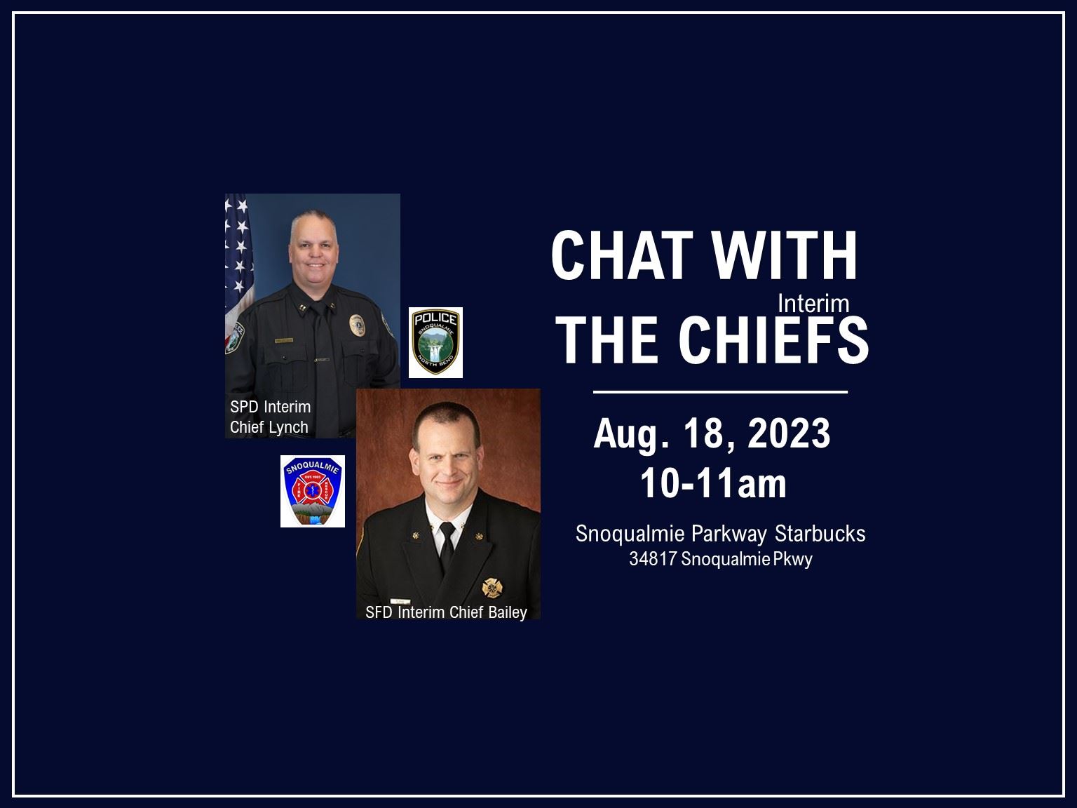So, grab a coffee and join your interim chiefs at the Snoqualmie Parkway Starbucks, 34817 Snoqualmie Parkway (next to MOD Pizza), from 10 am to 11 am on Aug. 18.