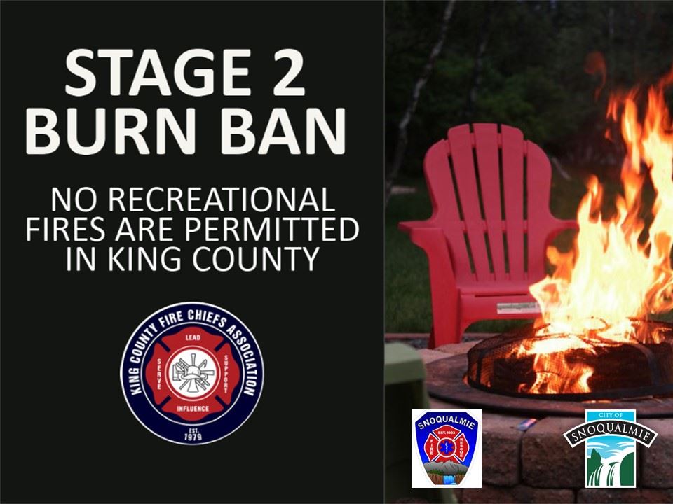 Effective immediately, in coordination with the King County Fire Chiefs Association, and the Association of King County Fire Marshals, a Stage 2 Complete Burn Ban has been implemented countywide, including Snoqualmie.