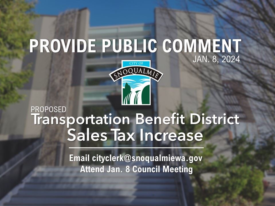 Residents are encouraged to provide comments to Councilmembers on the proposed TBD sales tax increase by attending the January 8 City Council meeting, beginning at 7 pm, in-person, online, or by submitting written comments. Written comments must be received by 5 pm, January 8, 2024, and should be emailed to cityclerk@snoqualmiewa.gov