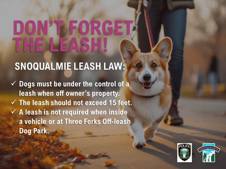The Snoqualmie Police Department is launching a Leash Law Public Education campaign. Follow the City of Snoqualmie and Snoqualmie Police Department social media channels for more information.