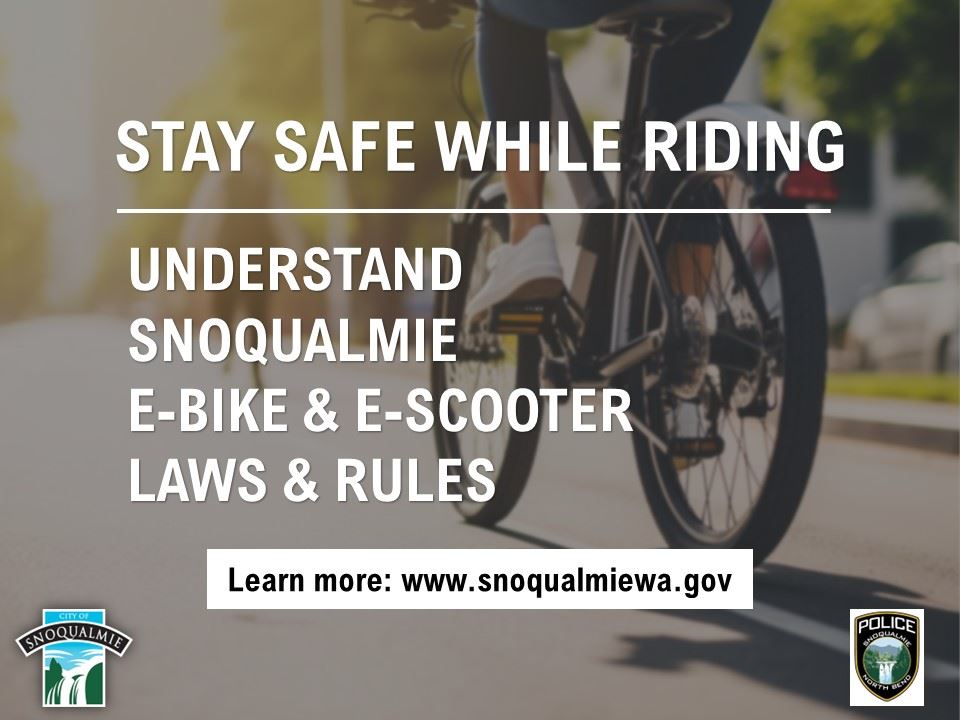 The Snoqualmie Police Department is launching a E-bike and E-scooter Public Education campaign. Follow the City of Snoqualmie and Snoqualmie Police Department social media channels for more information.
