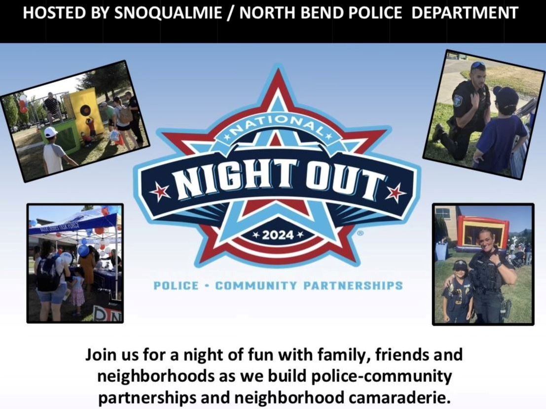 The Snoqualmie Police Department is pleased to host its annual National Night Out event on Tuesday, August 6, 2024, from 4-8 pm, at Si View Park in North Bend.