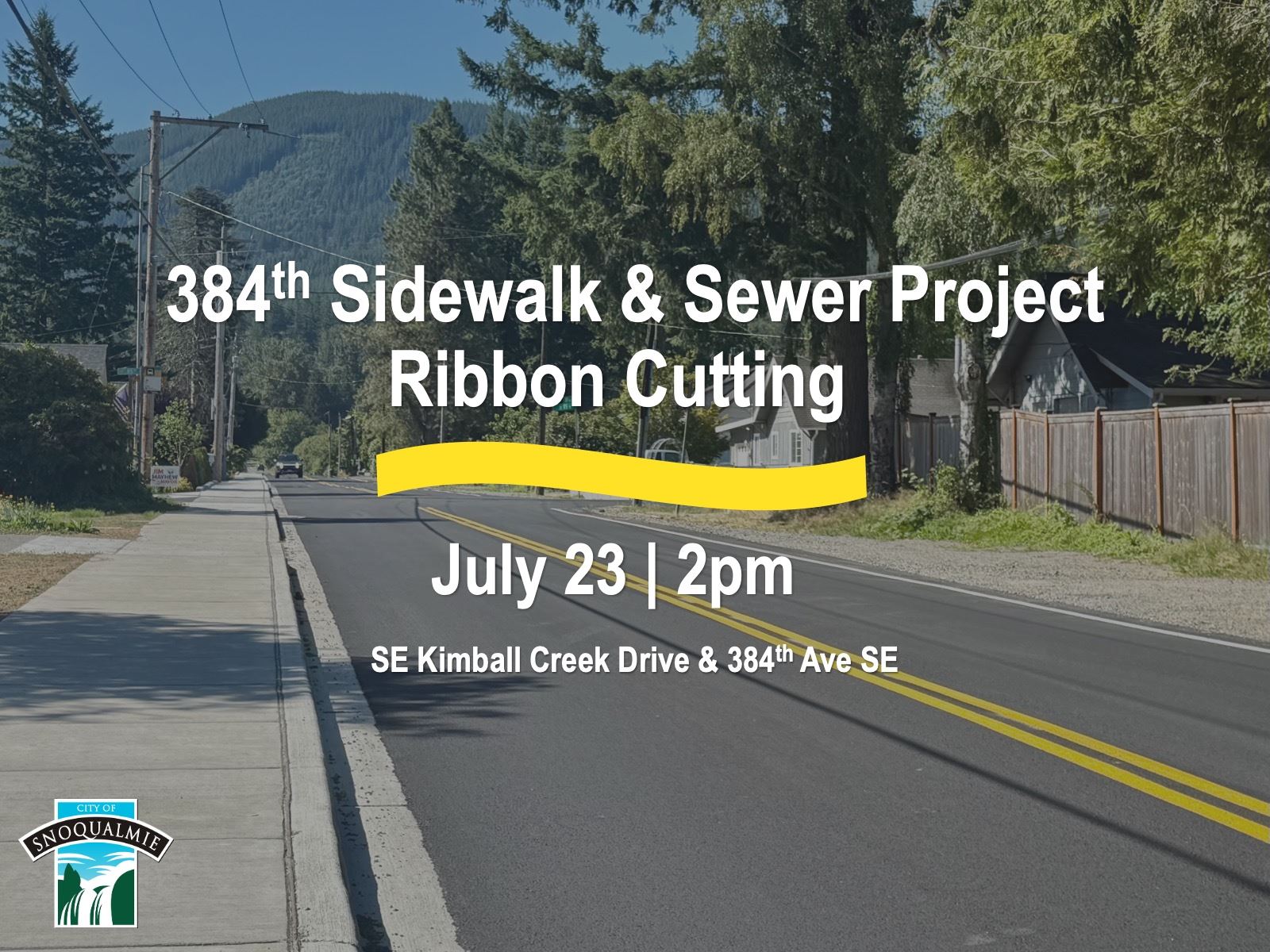 Community members are invited to a special ribbon cutting to celebrate important safety and infrastructure improvements on 384th Ave SE in downtown Snoqualmie. The ribbon cutting happens on Wednesday, July 23, 2025, at 2pm, at the corner of SE Kimball Creek Drive and 384th Ave SE.