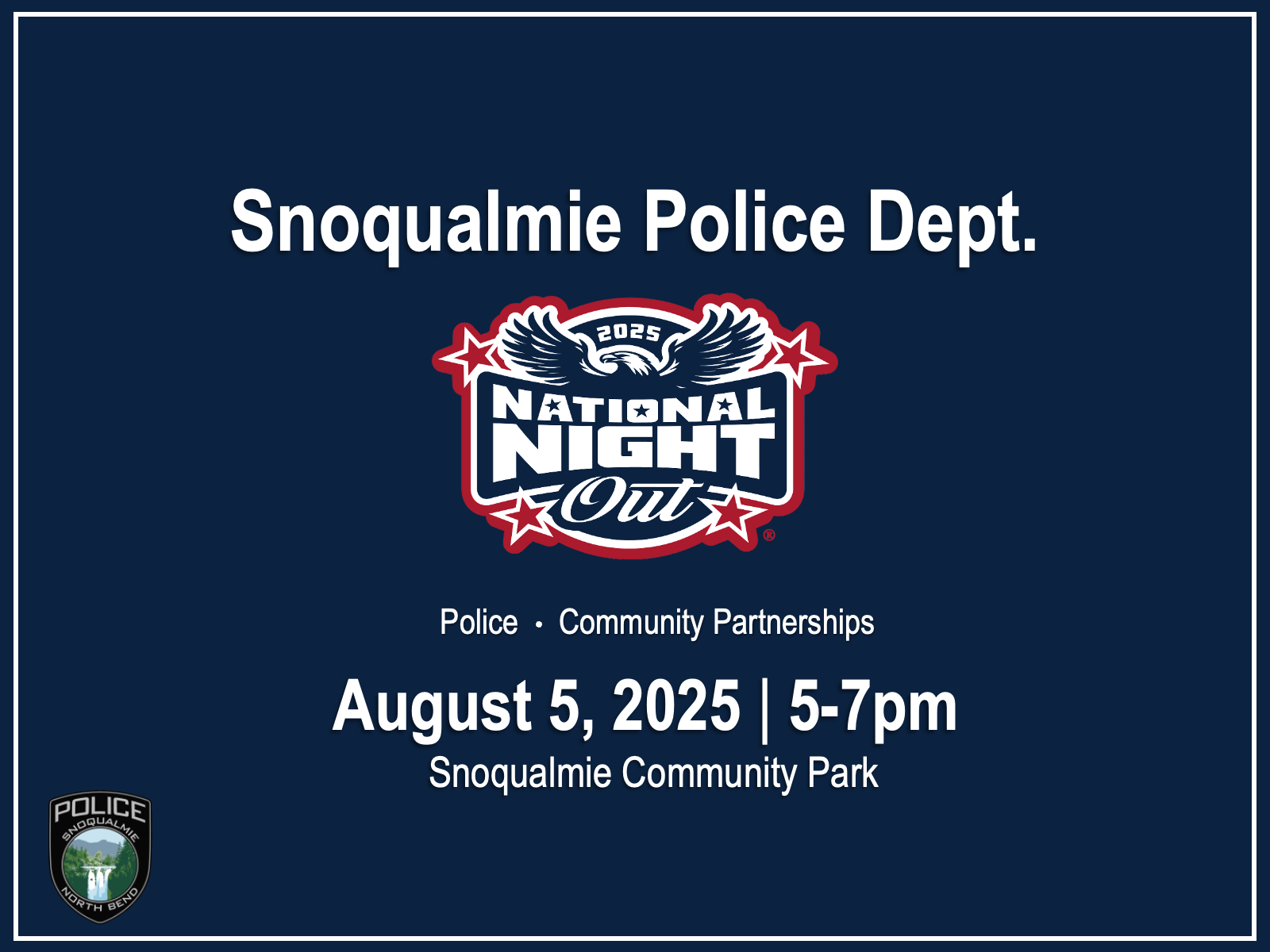 The Snoqualmie Police Dept. is pleased to host National Night Out on Tuesday, August 5, 2025, 5-7pm, returning to Snoqualmie Community Park. An evening designed to build stronger community ties and meet local law enforcement.