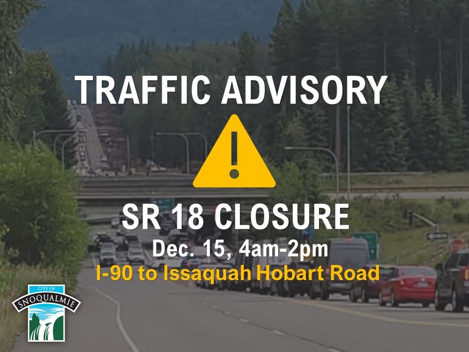 Residents who use SR 18 between Snoqualmie and Issaquah-Hobart Road should plan for alternative routes and extra travel time on Friday, December 15, 2023. The Washington State Department of Transportation (WSDOT) will fully close SR 18 between I-90 and Issaquah-Hobart Road from 4 am to 2 pm to make emergency asphalt repairs.