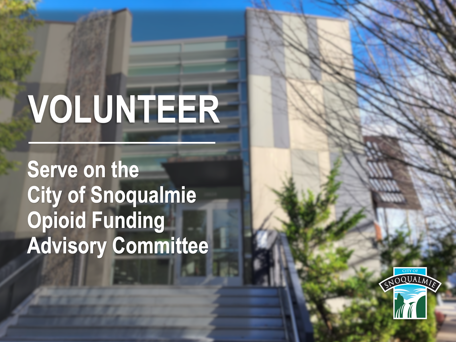 The City of Snoqualmie is creating an Opioid Funding Advisory Committee and is looking for community volunteers.  Interested parties should reside within Snoqualmie city limits and have a background in substance abuse services, healthcare, or human services organizations assisting those affected by opioid use.